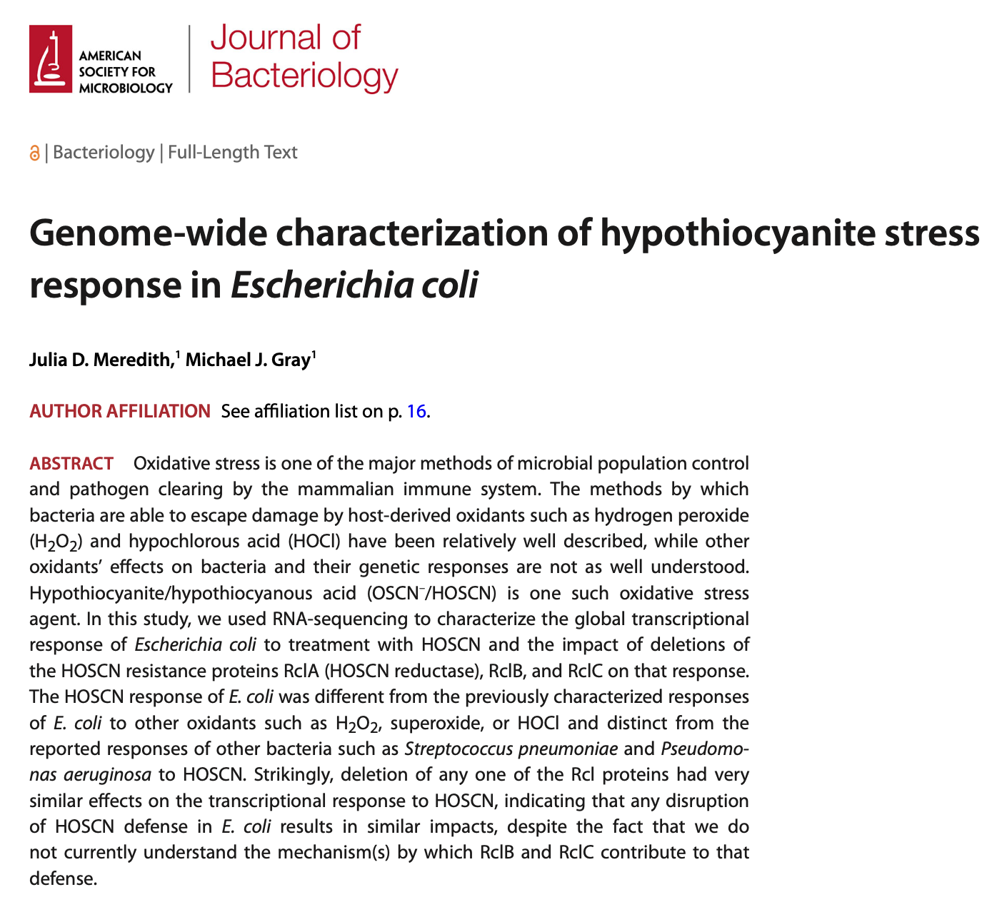 Check out our latest paper on bacterial HOSCN stress response, online now at the Journal of Bacteriology!