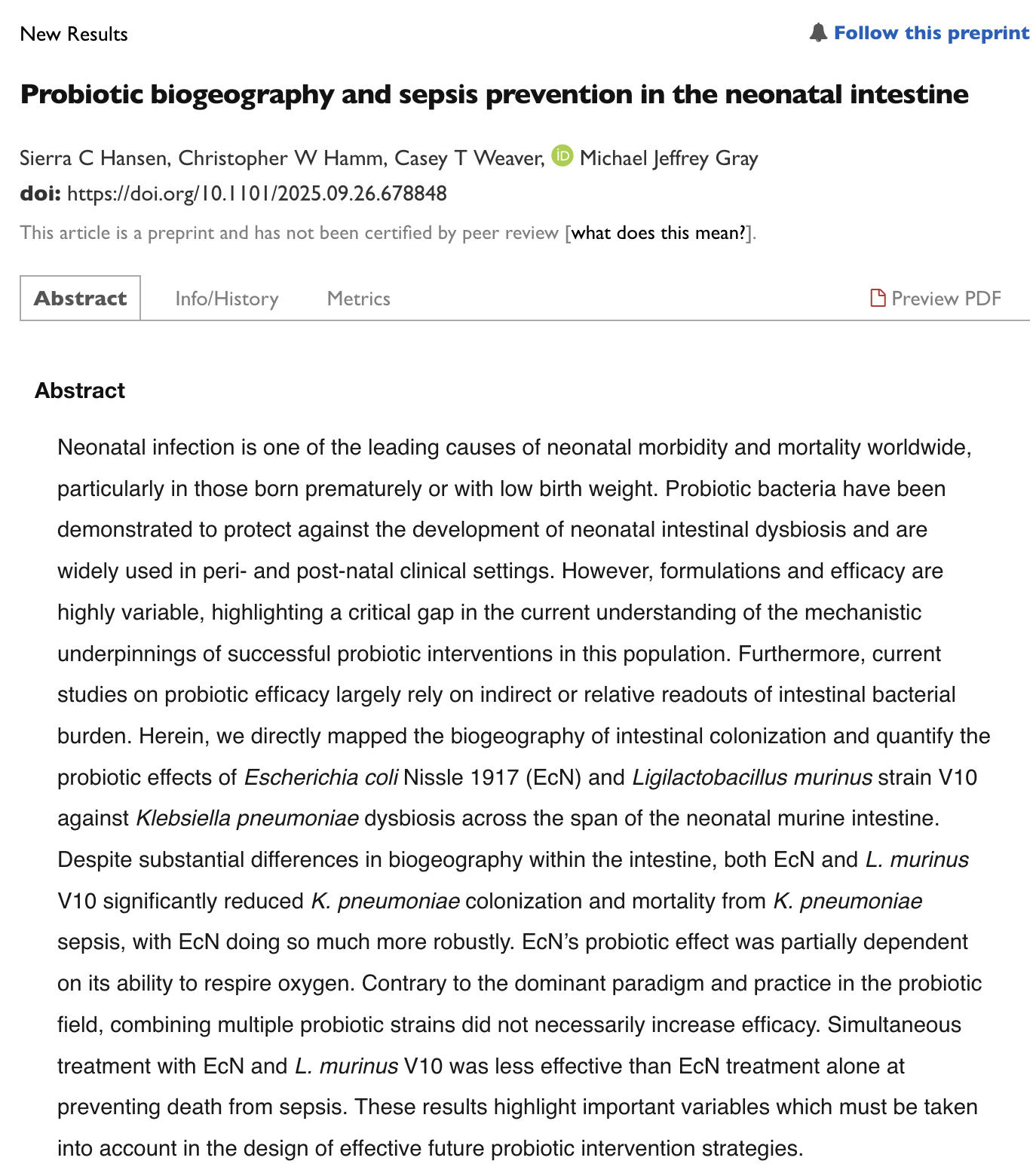 We use a combination of genetic, genomic, and biochemical techniques to study how bacteria sense and respond to their environments. We are particularly interested in the molecular biology of the symbiotic and probiotic bacteria that make up the healthy microbiome, and are working to identify new regulators, proteins, and pathways that may influence the interactions between bacteria and their human or animal hosts. Our current research has three primary tracks: